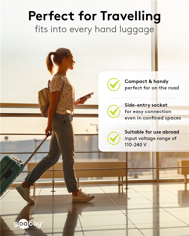 • Aufgrund des Eingangsspannungsbereichs von 100-240 V ist das Goobay-Netzteil auch im Ausland einsetzbar.
