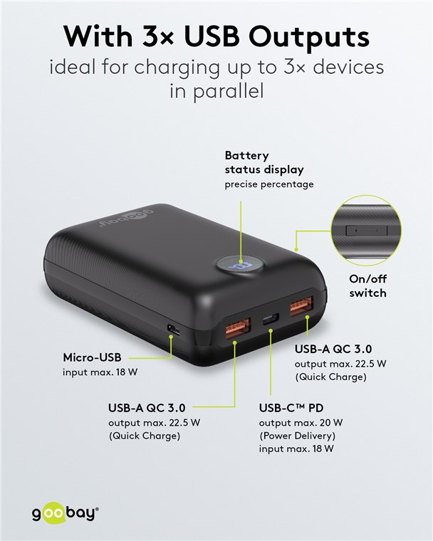 Weiterführende Links zu "Goobay 65869 Powerbank 20.000 mAh VPE Retail Box Mindestbestellmenge 1"