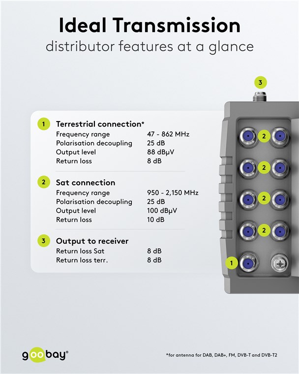 • Via DiSEqC 2.0 sind zwei Satelliten-Positionen schaltbar, die über Koaxkabel auf bis zu 4 Teilnehmer verteilt werden können, z. B. auf Sat-Receiver oder Fernseher mit Sat-Tuner