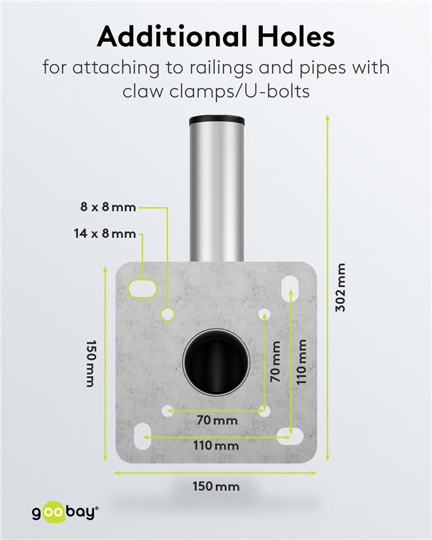 • Zusätzliche Bohrungen ermöglichen die Befestigung mit Rohrschellen Typ U am Balkongeländer oder an vertikalen Rohren, Lochabstand: 70 mm