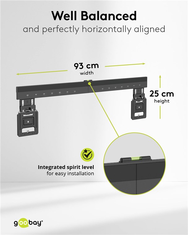 • Für eine präzise Installation und Ausrichtung verfügt die Querschiene über praktische, VESA®-kompatible Abstandsmarkierungen und eine eingebaute Wasserwaage
