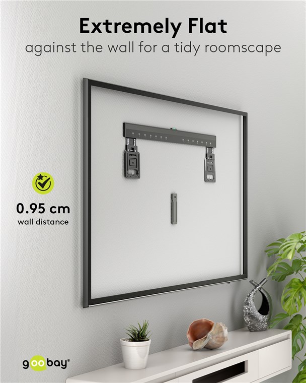 • Extrem flache TV-Halterung mit einem Wandabstand von nur 9,5 mm, durch die das Gerät optisch nahezu mit der Wand abschließt und nicht in den Raum hineinragt