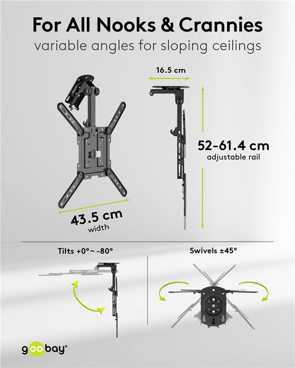 • Praktische TV-Halterung für die Montage an Dachschrägen, in oder unter Schränken und in verschiedenen Arbeitsbereichen
