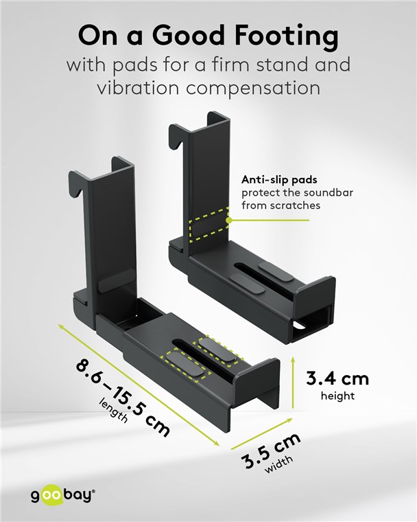 • Variabel einstellbare Halterung für die meisten gängigen Soundbars bis zu einer Tiefe von 86-155 mm, z. B. von Samsung, LG, Sonos, Sennheiser, Teufel oder JBL