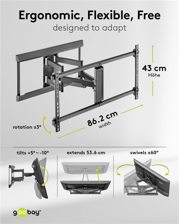 • Maximal flexible TV-Halterung für den optimalen Blickwinkel: +5/-10° neigbar (oben/unten), +60/-60° schwenkbar (links/rechts), 53,6 cm ausziehbar