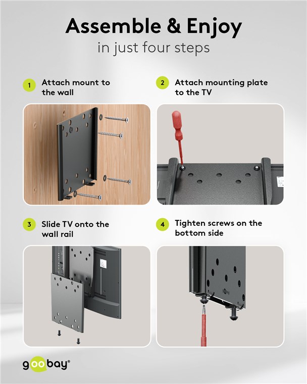 • Montagefreundlich: Im ersten Schritt wird der Fernseher an die Montageplatte geschraubt und im zweiten Schritt über die zuvor angebrachte Wandschiene geschoben