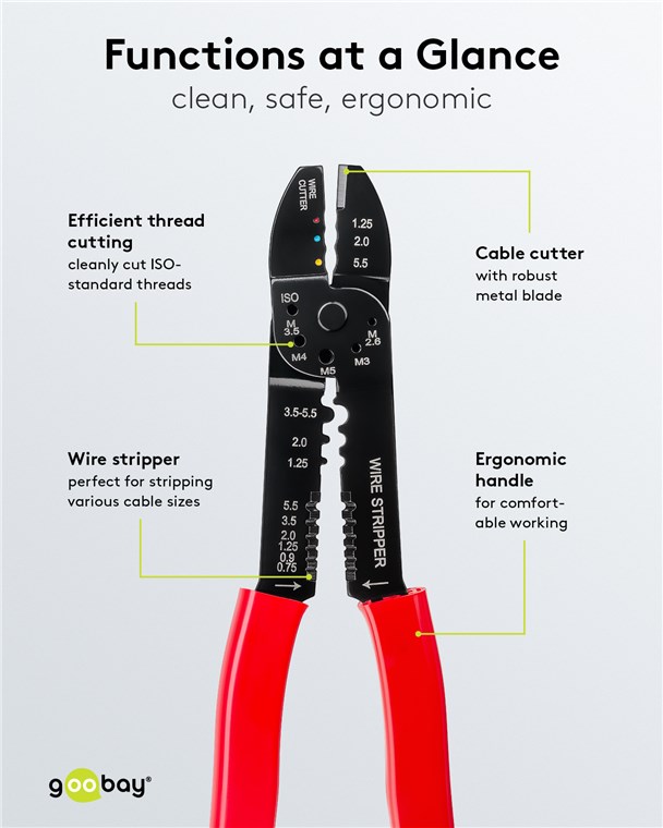 • Durch das ausgeklügelte System aus integrierten Gewindelöchern schneidet die Crimperzange selbst Schrauben und Gewindestifte aus Kupfer oder Messing präzise zu (M 2,6, M 3, M 3,5, M 4, M 5)