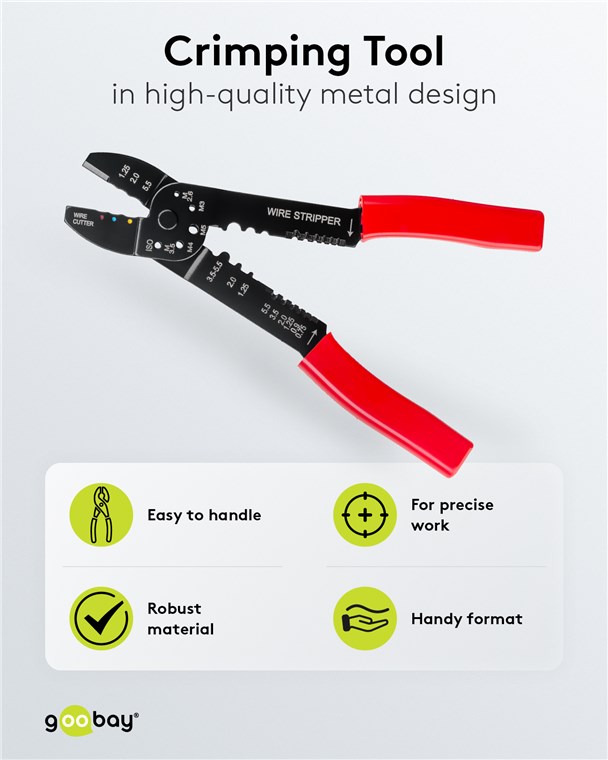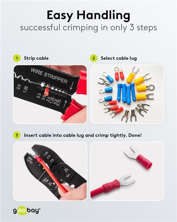 • Geeignet zum Crimpen von unisolierten, offenen Steckverbindern mit den Querschnitten 1,25 mm², 2,0 mm² und 3,5-5,5 mm², z. B. MC4-Stecker an Solarkabel