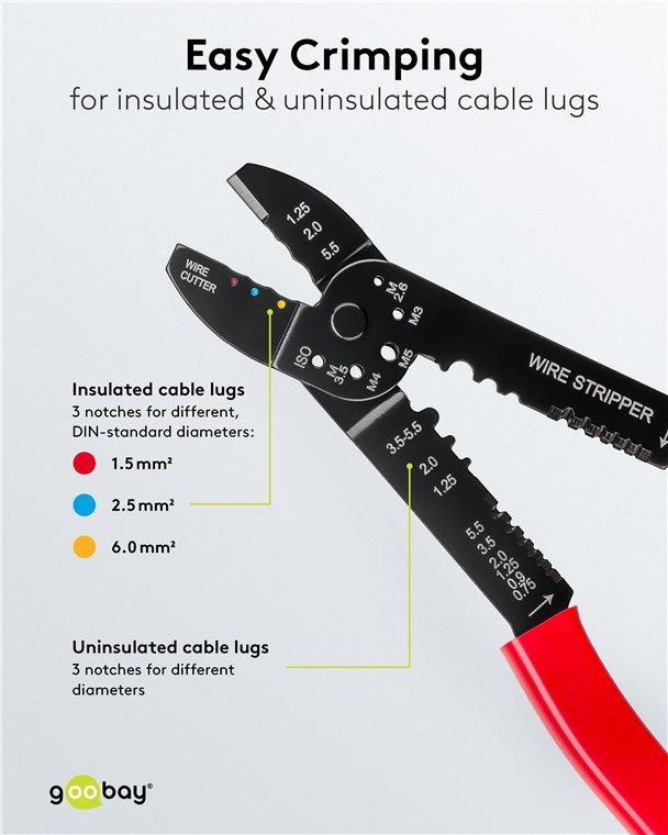 • Passgenaue Öffnungen für die Kabelquerschnitte 0,75 mm², 0,9 mm², 1,25 mm², 2,0 mm², 3,5 mm² und 5,5 mm² verhindern beim Abisolieren die Beschädigung einzelner Litzendrähte