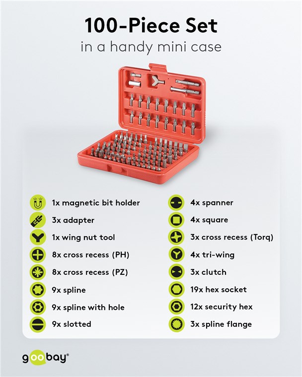 • Bits: 8x Kreuzschlitz (PH), 8x Kreuzschlitz (PZ), 4x Vierkant, 3x Kreuzschlitz (Torq), 9x Flachschlitz, 4x Spanner, 9x Keilprofil, 9x Keilprofil mit Stift, 4x Tri-Wing, 3x Clutch, 19x Innensechskant, 3x Vielzahn, 12x Innensechskant mit Stift