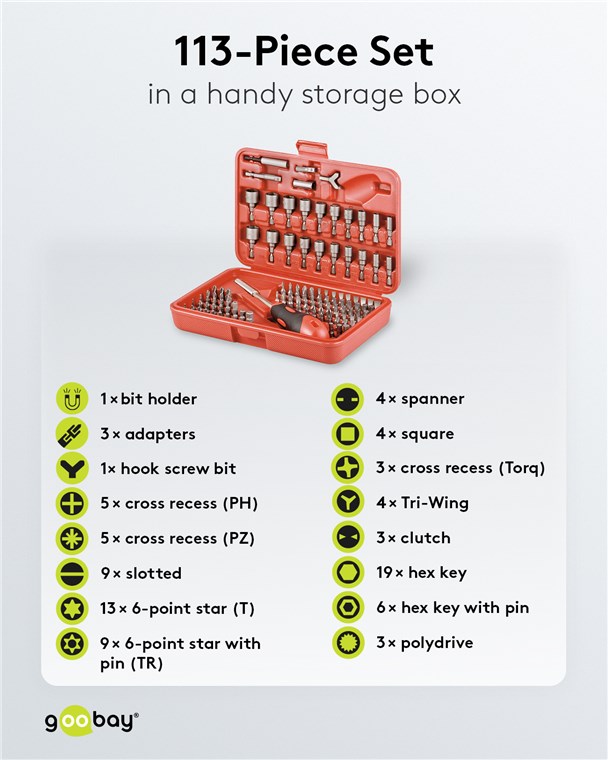 Mit dem gut sortierten Bit-Set lässt sich für jede Anwendung und jede Schraube der benötigte Bit finden - schnell und einfach, ohne lange nach dem passenden Schraubenzieher suchen zu müssen. Der Bitsatz erspart so die Anschaffung einzelner Schraubendreher, schafft Platz in der Werkzeugkiste und ist durch das kompakte Format perfekt für den mobilen Einsatz geeignet.