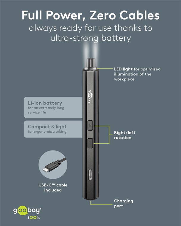 Weiterführende Links zu "Goobay Tools 77838 Elektrischer Schraubendreher mit 20-tlg. Präzisions-Bitsatz VPE Retail Box Mindestbestellmenge 1"