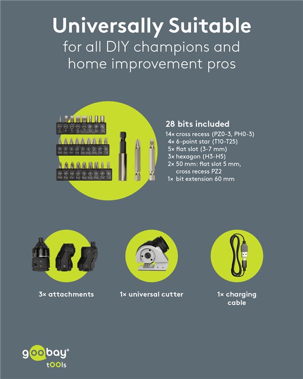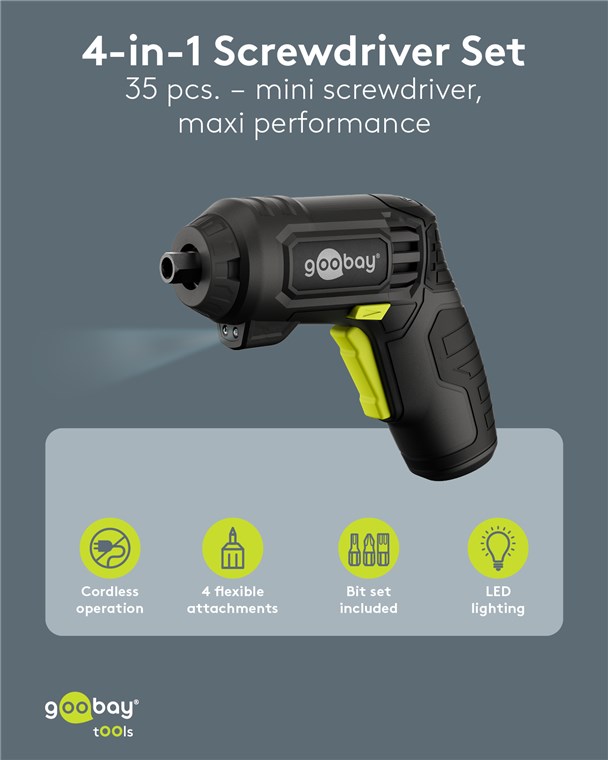 Weiterführende Links zu "Goobay Tools 77817 4in1 Mini-Akkuschrauber-Set 35-tlg. VPE Sleeve Mindestbestellmenge 1"