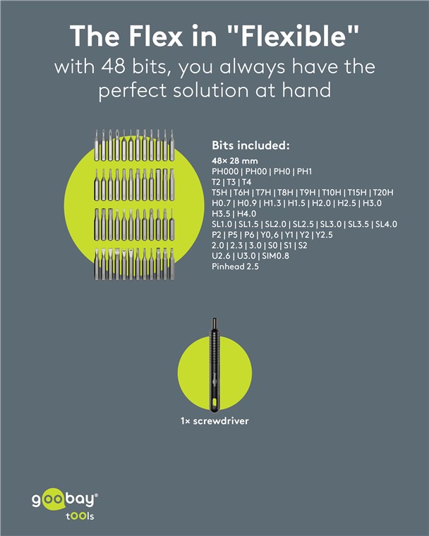 Weiterführende Links zu "Goobay Tools 77835 Schraubendreher-Set mit 48-tlg. Präzisions-Bitsatz VPE Retail Box Mindestbestellmenge 1"