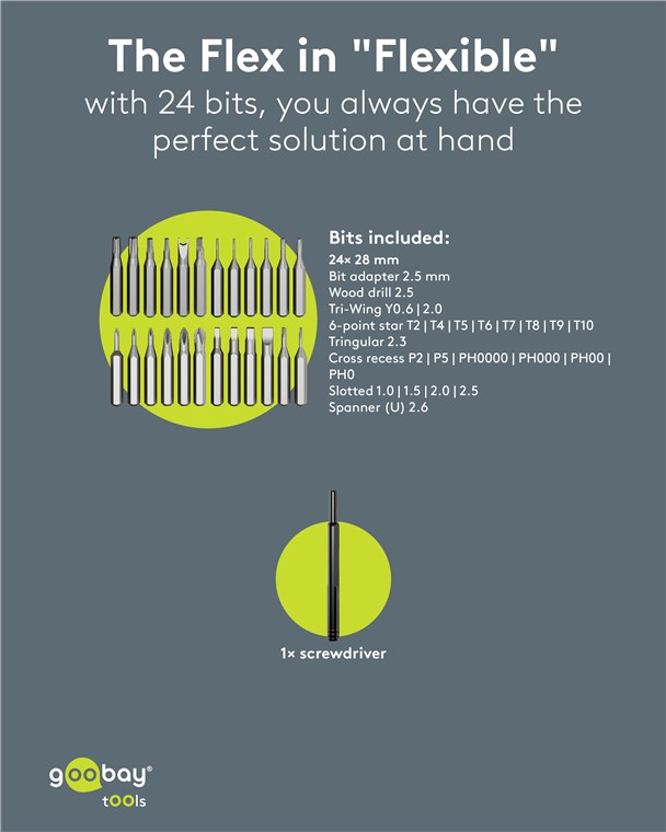 Weiterführende Links zu "Goobay Tools 77836 Schraubendreher-Set mit 24-tlg. Präzisions-Bitsatz VPE Retail Box Mindestbestellmenge 1"
